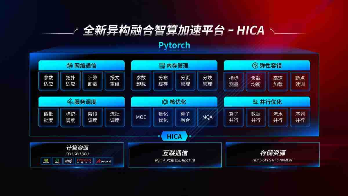 通过自研的服务层、、、中间适配层、、、以及调度编排算法,,采用数据并行、、、模型并行等多种并行方式,,把并行计算任务进行有效的分解,,使其分别由相应的软件栈和算力资源来承接。。。。当GPU资源变化,,,HICA可以实时动态调度计算子任务并调整模型拓扑和架构,,以充分聚合各种算力资源。。。。